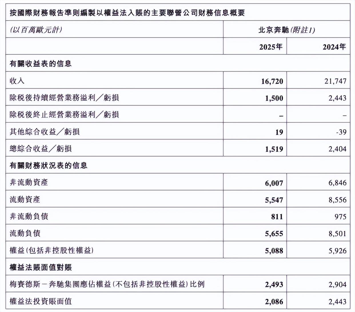 根据北京汽车3月5日披露的公告,北京奔驰2025年实现收入167.2亿欧元,同比减少23.12%;除税后持续经营业务溢利15亿欧元,同比减少38.6%;总综合收益15.19亿欧元,同比减少36.81%。值得警惕的是,这已是北京奔驰连续第三年营收净利双降:2023年营收同比下降9.4%、税后利润下降17.8%,2024年营收同比下降3.4%、净利润下降18.5%,而2022年仍是其业绩峰值,当年营收达248.2亿欧元,税后净利润36.5亿欧元,短短三年间,盈利规模近乎腰斩。