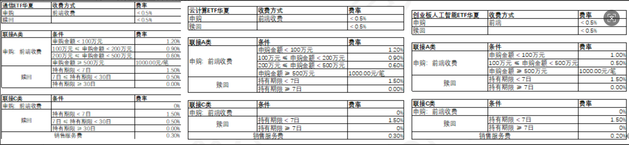 注:以上所提及ETF均不收取申购费、赎回费、销售服务费,申购赎回代理机构可按照不超过0.5%的标准收取佣金,其中包含证券交易所、登记结算机构等收取的相关费用;此外,相关ETF及联接的管理费率和托管费率如下所示:
