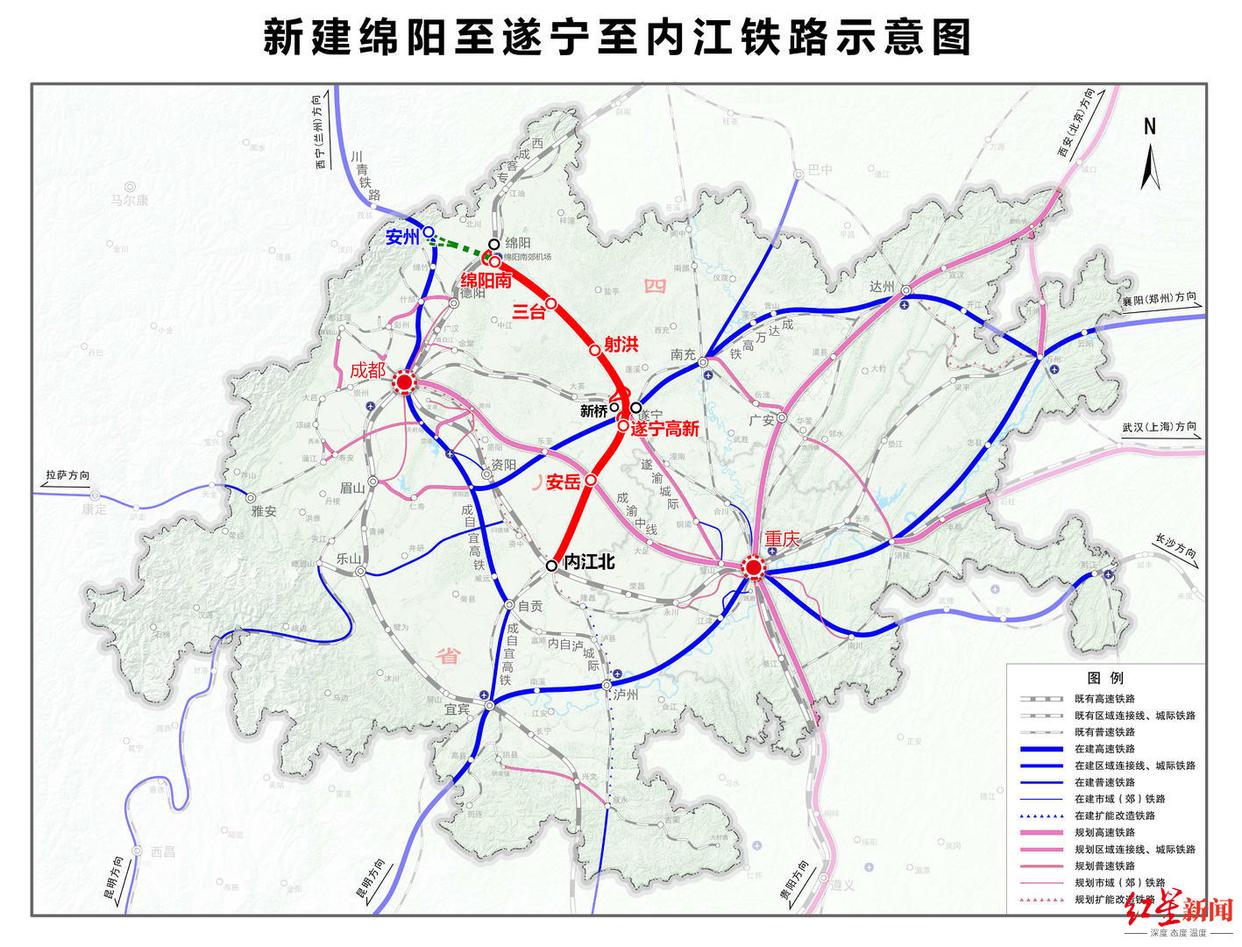 绵遂资内铁路线路以绵阳站为起点,终至内江北站,贯穿绵阳、德阳、遂宁、资阳、内江五市共11个县级行政区,正线全长287.9公里,设计时速250公里。该项目已列入国家《中长期铁路网规划》及成渝地区双城经济圈轨道交通专项规划,其中绵阳至遂宁段,计划于2028年建成通车。