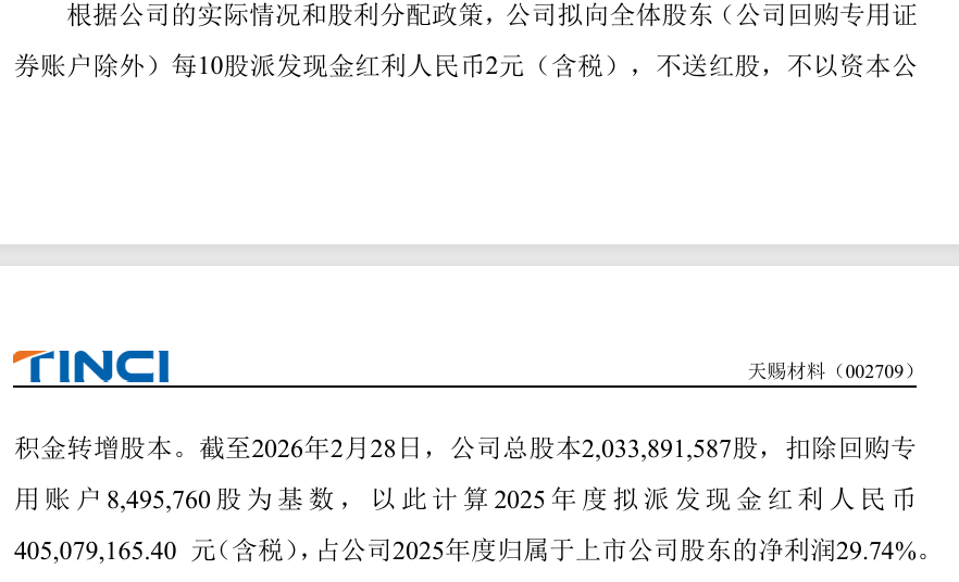 天赐材料(002709)公告称,根据公司的实际情况和股利分配政策,公司拟向全体股东(公司回购专用证券账户除外)每10股派发现金红利人民币2元(含税),不送红股,不以资本公积金转增股本。截至2026年2月28日,公司总股本20.34亿股,扣除回购专用账户849.58万股为基数,以此计算2025年度拟派发现金红利人民币4.05亿元(含税),占公司2025年度归属于上市公司股东的净利润29.74%。