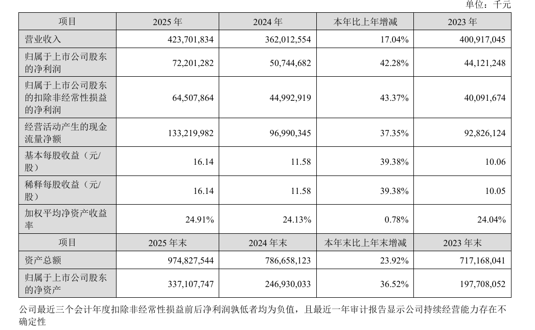 宁德时代还披露了2025年年报,公司2025年实现营业收入4237.02亿元,同比增长17.04%;归属于上市公司股东的净利润722.01亿元,同比增长42.28%。