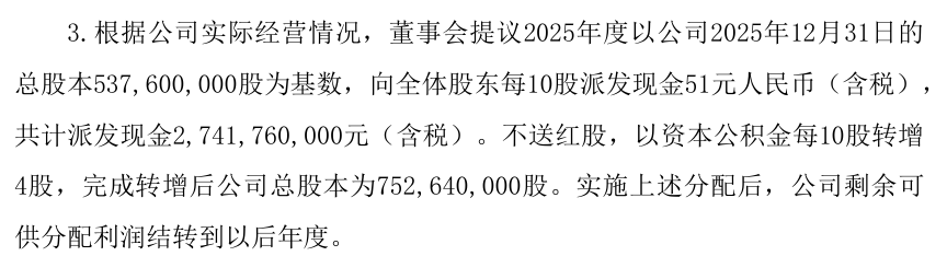 同花顺还公布了2025年度利润分配方案预案,拟以公司2025年12月31日的总股本5.376亿股为基数向全体股东每10股派发现金51元人民币(含税),共计派发现金27.42亿元(含税),以资本公积金每10股转增4股,不送红股。