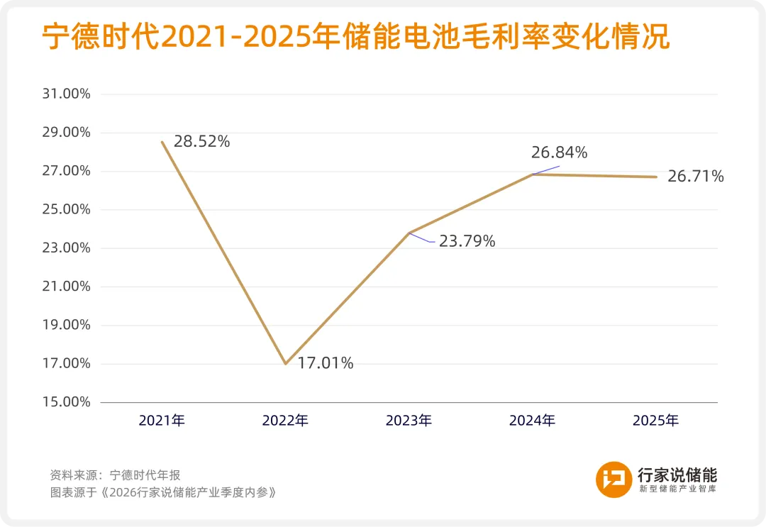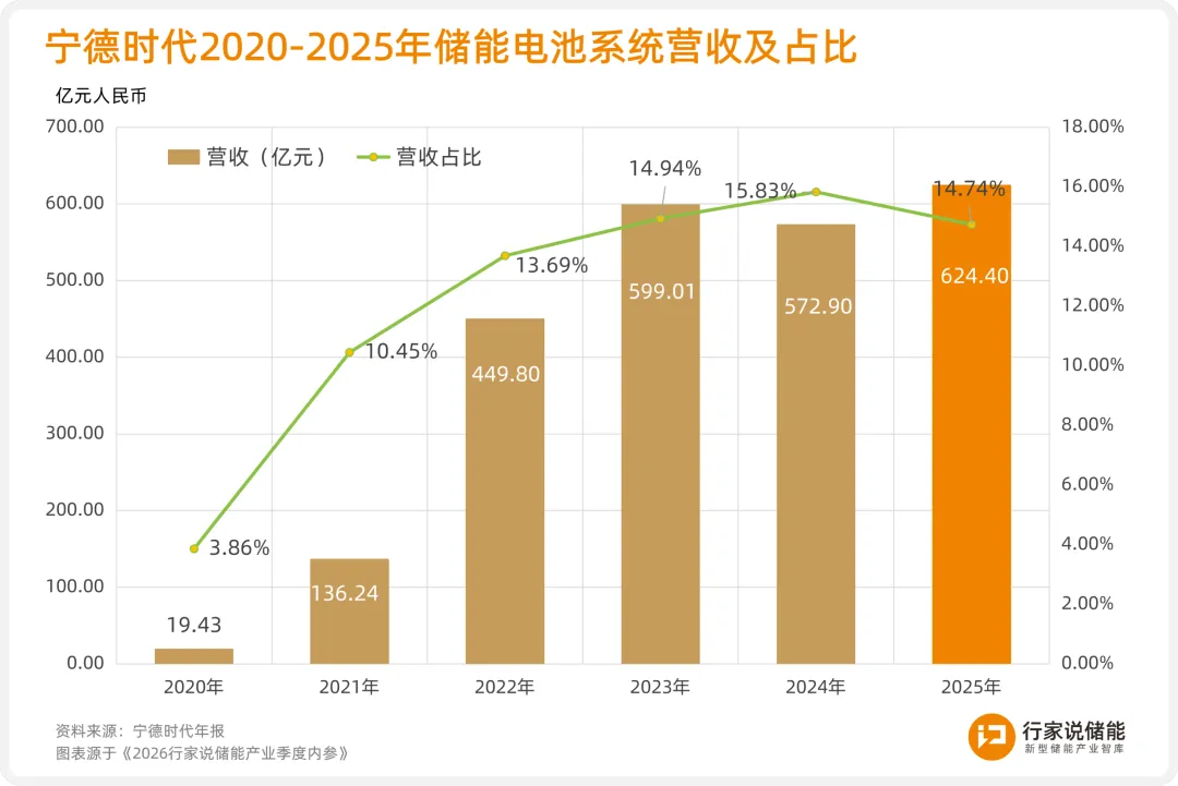 从业务结构来看,2025年,宁德时代储能电池系统营收为624.4亿元,相比2024年上涨了8.99%,2025年储能营收占比为14.74%,略有下滑,但其26.71%的毛利率,高于动力电池毛利率23.84%。