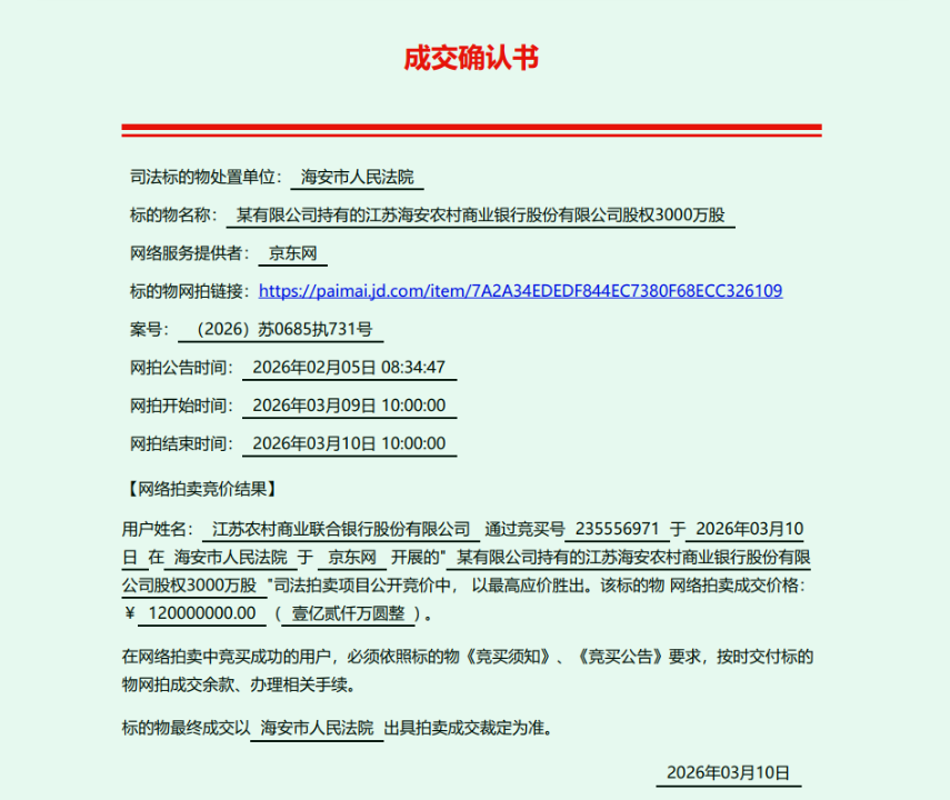 通过上述两次拍卖,江苏农商联合银行共获得海安农商行3900万股股权,累计耗资1.56亿元。股权交割完成后,江苏省苏中建设集团股份有限公司将退出海安农商银行前十大股东名单,而江苏农商联合银行将成为该行第五大股东。