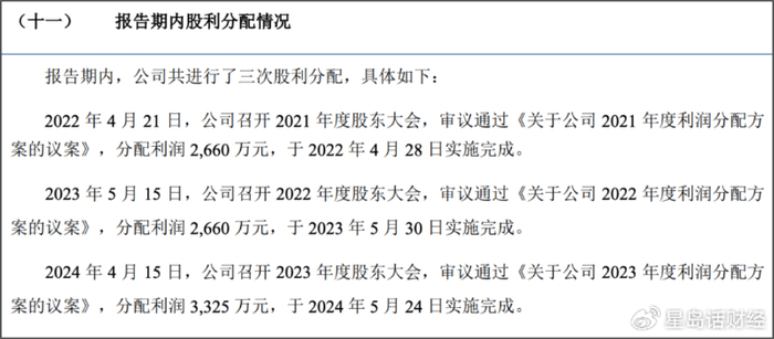 研发低投入的同时,固力发却在报告期内进行了大额的现金分红。招股书显示,2022年4月至2024年4月,公司分别分派现金2660万元、2660万元和3325万元。值得注意的是,2025年4月29日,距离其递交北交所IPO申报材料仅月余,固力发仍决定再次现金分红3325万元。