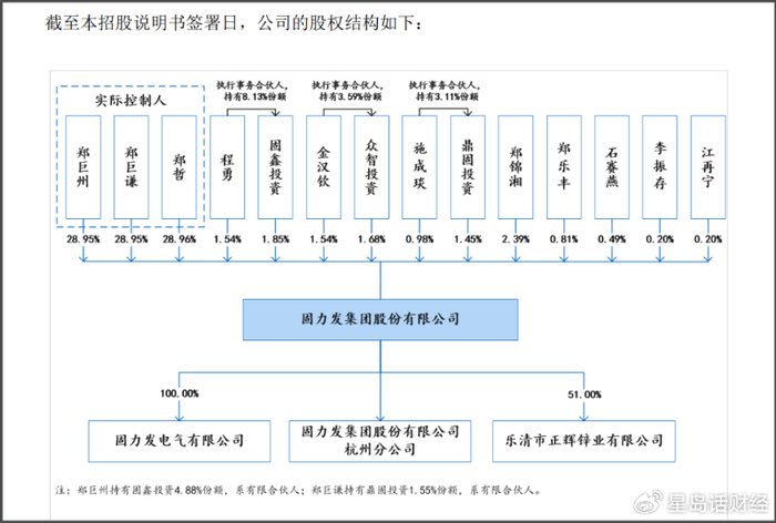 股权结构显示,郑巨州、郑巨谦、郑哲分别直接持有固力发28.95%、28.95%以及28.96%的股权,三人直接、间接合计持有固力发86.98%的股权。郑巨州、郑巨谦、郑哲三人为亲兄弟关系。