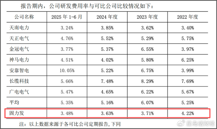 《回复》指出,固力发的研发投入占比已连续三年下滑:从2022年的4.2%降至2023年的3.9%,2024年进一步降至3.6%,低于可比公司均值。主要原因系研发人员规模相对较小,总体职工薪酬水平相对较低。