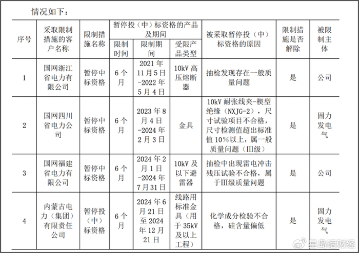 2024年6月至12月:因标准金具化学成分(硅含量)不合格,被内蒙古电网暂停中标6个月。