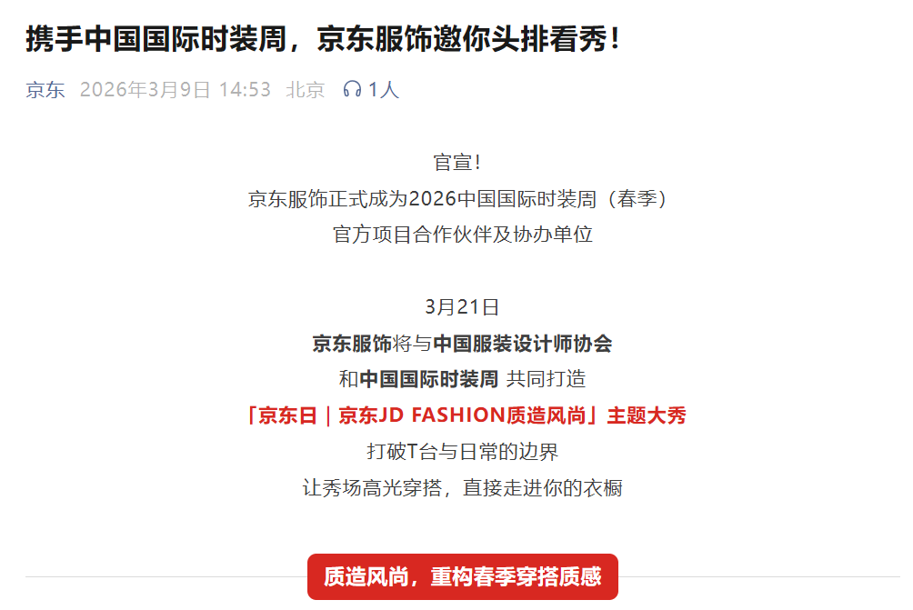 2026年3月9日,京东正式官宣旗下京东服饰正式宣布与中国服装设计师协会及中国国际时装周达成深度战略合作。作为2026中国国际时装周(春季)的官方项目合作伙伴及协办单位,京东将于3月21日在北京798·751园区97罐举办“京东日|京东JD FASHION质造风尚”主题大秀。