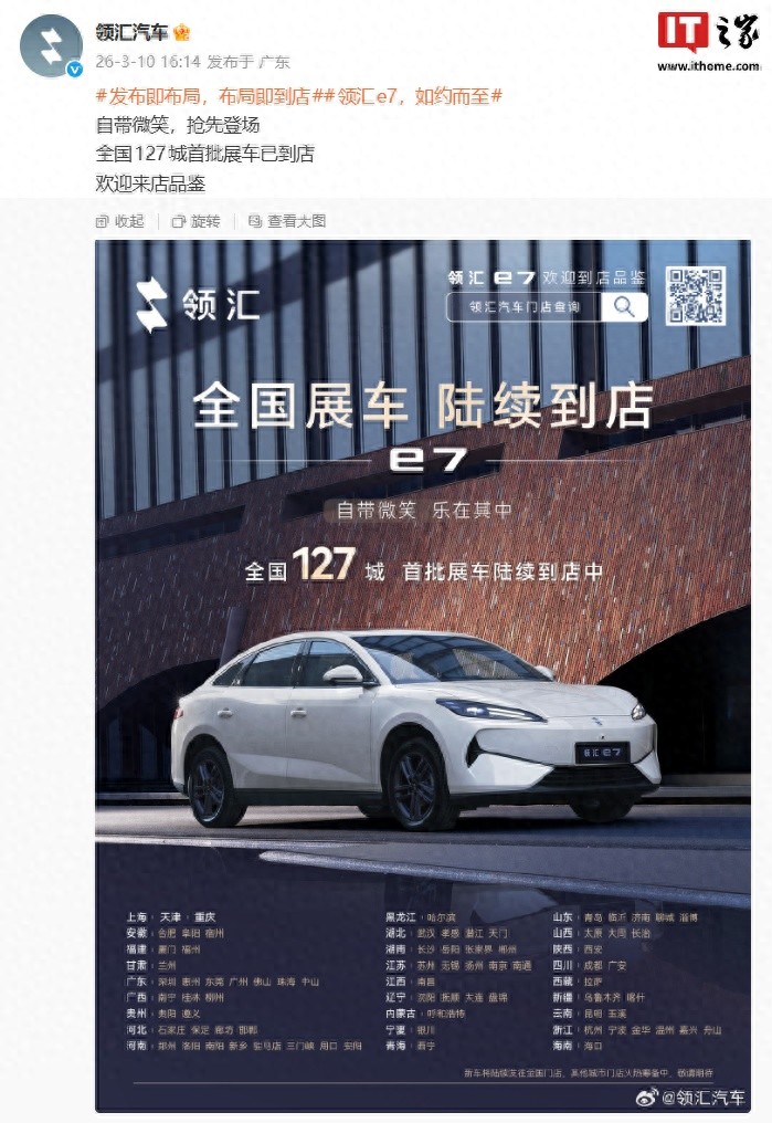 IT之家 3 月 10 日消息,比亚迪领汇汽车今日宣布,领汇 e7 全国 127 城首批展车已到店,覆盖上海、天津、重庆等城市,主打“发布即布局,布局即到店”。