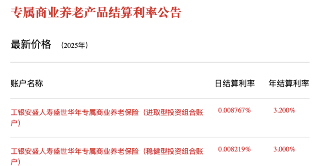 官网显示,工银安盛人寿盛世华年专属商业养老保险进取型投资组合账户日结算利率0.008767%,年结算利率3.2%;稳健型型投资组合账户日结算利率0.008219%,年结算利率3%。