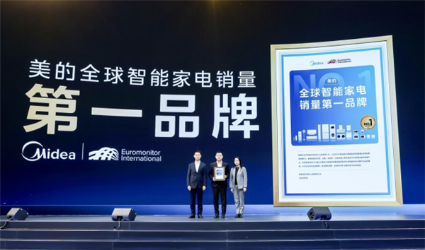 发布会现场,欧睿中国区总经理穆愔为美的颁发2025年全球智能家电销量第一证书,中国家电研究院副院长曲宗峰现场见证。这一认证,为美的的全屋智能战略落地提供了有力的市场背书。