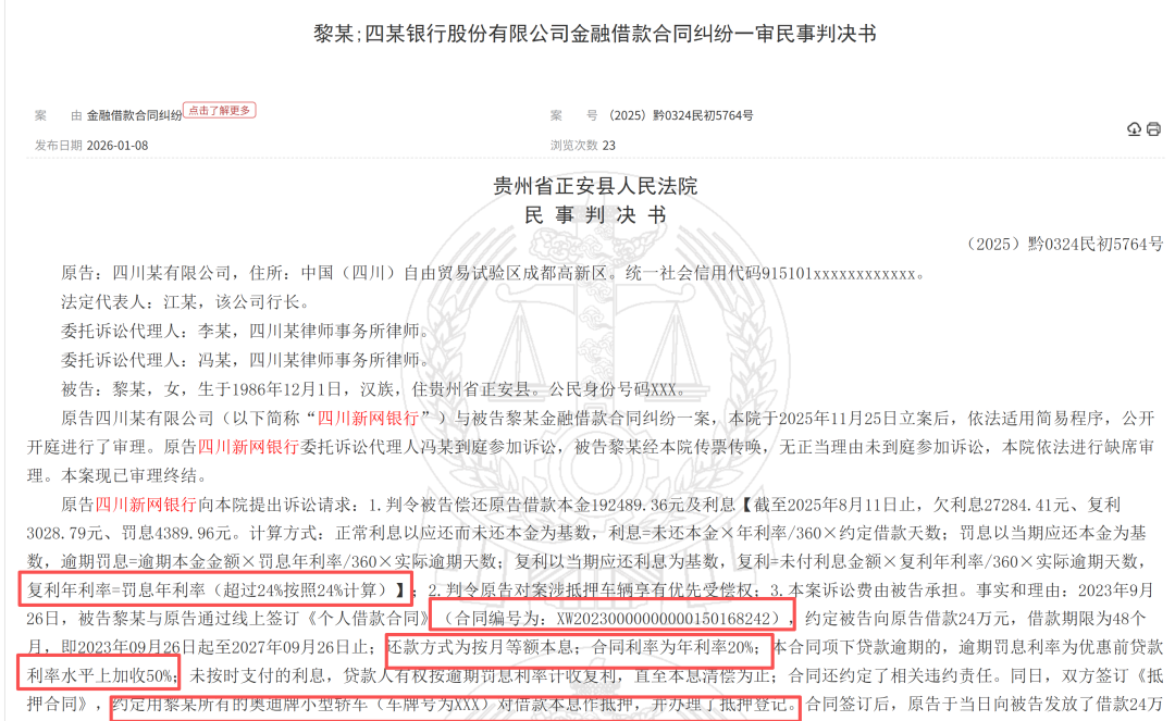 另一则《(2025)黔0324民初5764号》显示,2023年9月26日,被告黎某与原告通过线上签订《个人借款合同》(合同编号为:XW20230000000000150168242),约定被告向原告借款24万元,借款期限为48个月,还款方式为按月等额本息,合同利率为年利率20%;本合同项下贷款逾期的,逾期罚息利率为优惠前贷款利率水平上加收50%。