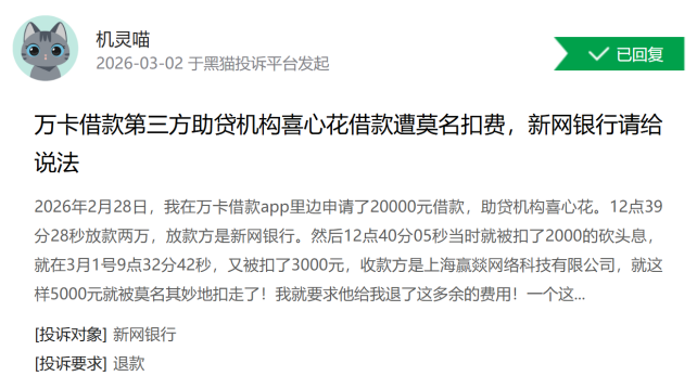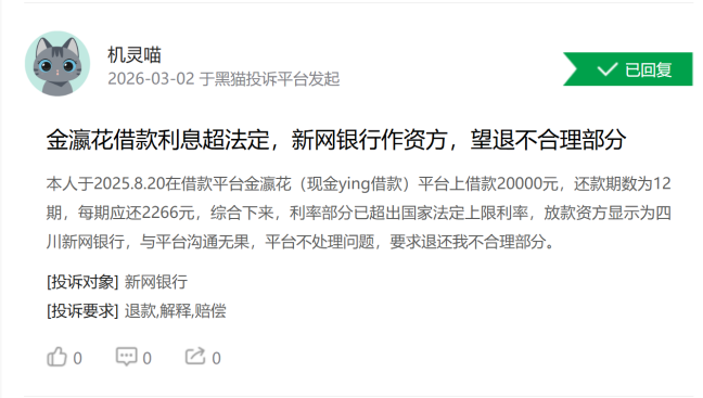 目前黑猫投诉上针对新网银行的投诉量达到9400多个,涉及到催收、利率、收费等方面的问题,还有多个帖子提到金瀛花、万卡等平台的放款方也是新网银行,但这些并不在新网银行的合作名单当中。