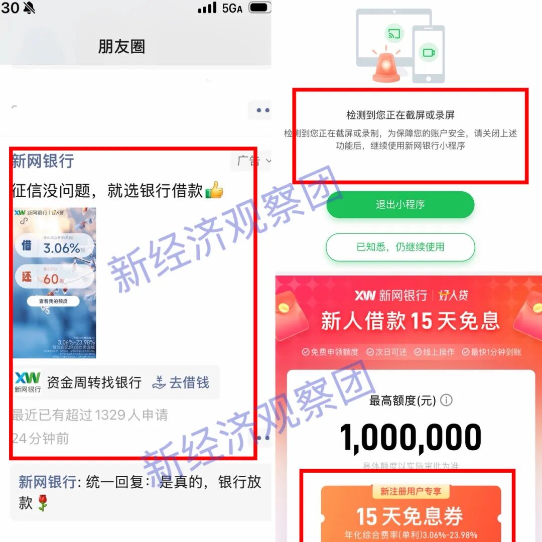 今年1月28日,新经济观察团小编在微信朋友圈频繁刷到新网银行“好人贷”的推广,页面用大字显示利率3.06%,但是右下角用白色小字又显示放款利率在3.06%-23.98%之间,即最高利率直逼24%的监管红线。此外,在小编尝试录屏后,新网银行小程序页面频繁弹出“安全提示”,要求关闭该功能后重启才能使用。在小编测试过的大量贷款平台中,新网银行这种做法还是首次遇见。