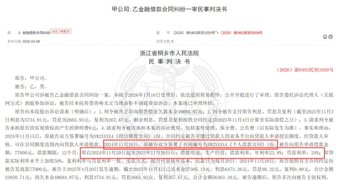 而裁判文书网的裁判文书也证实了新网银行擦着24%利率放款的事实。《(2026)浙0483民初1059号》显示,2024年11月20日,新网银行与被告双方签署了合同编号为XW2XXXX4《个人借款合同》1份,被告向原告申请借款金额77000元,借款期限12个月,借款用途为生产经营;借款利率为年利率23.8%;罚息利率24%,即贷款实际利率水平上加收50%,复利利率与罚息利率一致。