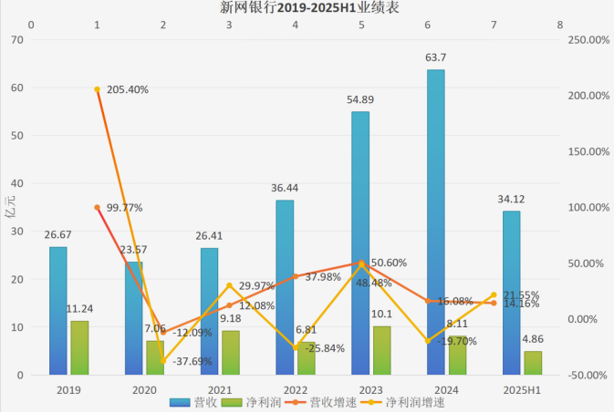 到了2025年上半年,新网银行资产总额为1056.96亿元,较年初上升了1.99%;负债总额为972.57亿元,较年初上升了1.65%。同期新网银行实现营收34.12亿元,同比上升14.16%;净利润为4.86亿元,同比上升21.55%。尽管还在保持稳健增长,但增速早已大不如前。