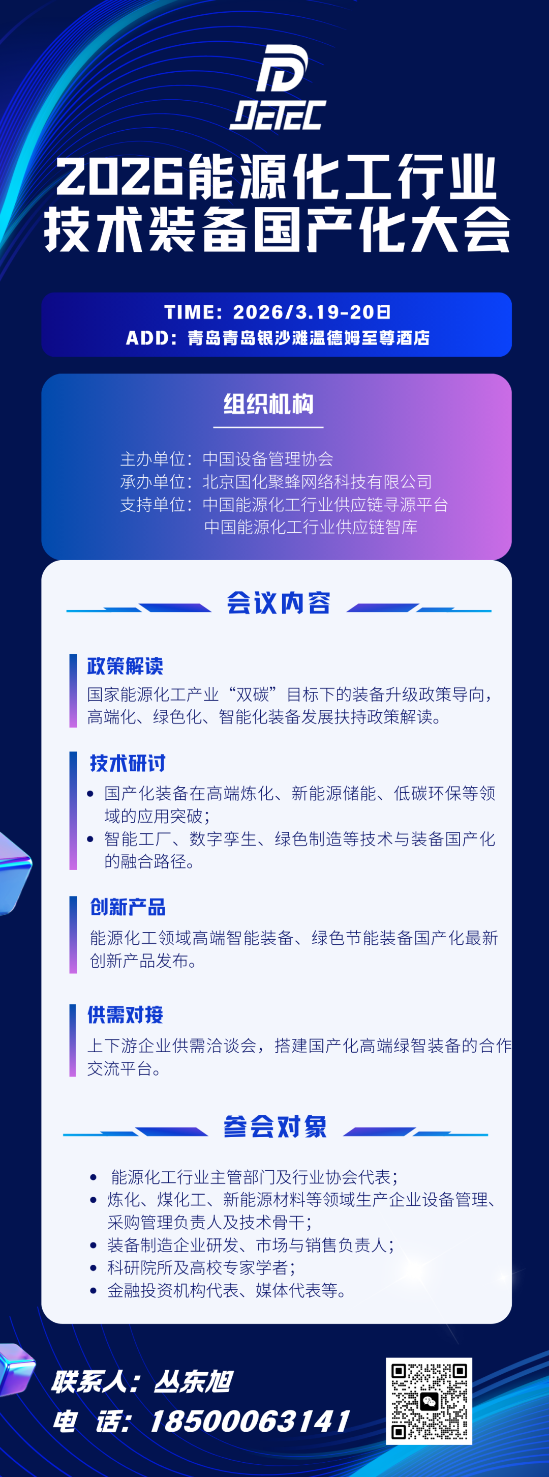 为落实能源化工产业高端化、绿色化、智能化转型部署,响应重点领域产品设备更新改造与节能降碳协同发展导向,持续巩固能源化工技术装备国产化品牌根基,助力产业链供应链自主可控与高质量发展,经研究,中国设备管理协会定于2026年3月中旬在山东省青岛市召开2026能源化工行业技术装备国产化大会。同期发布2026年度能源化工行业装备创新产品。