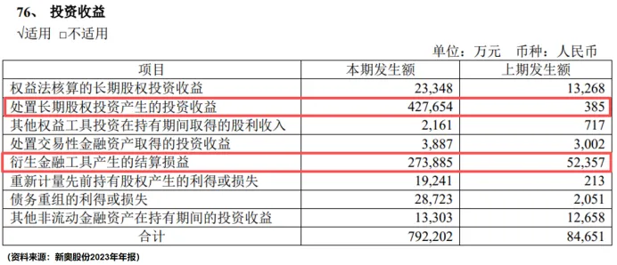 年报显示,公司当年处置长期股权投资产生的投资收益就有42.77亿,衍生金融工具产生的结算损益也高达27.39亿,从而增厚了当期净利润。