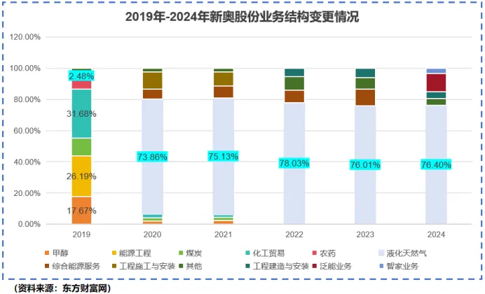 2020年-2024年,新奥股份天然气业务的营收占比始终维持在75%左右的较高水平,成为国内知名的民营天然气大厂。