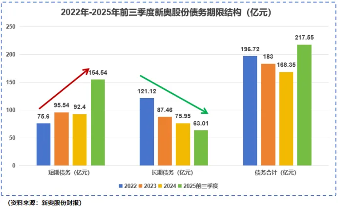 2022年-2025年前三季度,新奥股份短期债务总额从75.6亿增长到154.54亿,长期债务却从121.12亿下降到63.01亿,财务费用降低到了4.13亿,仅为原来的15%左右,财务优化初见成效。