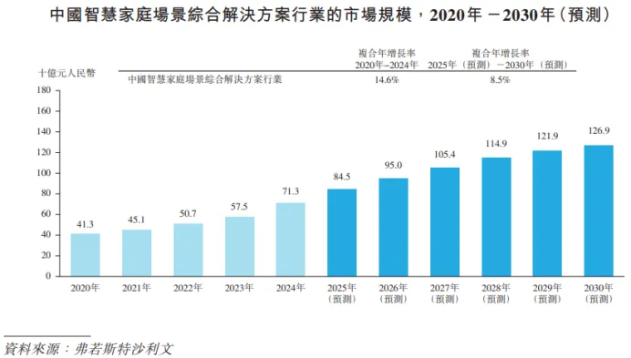近年来,伴随国内居民对生活品质需求的上升,智家业务的市场规模预计将从2025年的845亿元扩大到2030年的1269亿元,年复合增长率预计达8.5%。