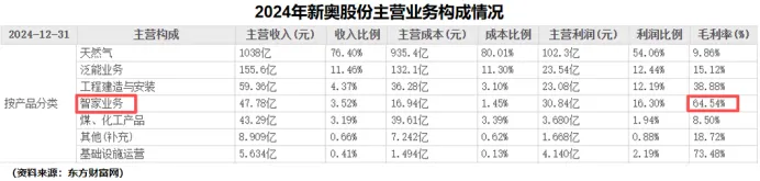 2024年,新奥股份智家业务初次登上公司主营业务结构表,就获得了64.54%的高毛利率,成为公司名副其实的“盈利王”。
