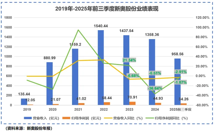 可这些收益终究是不可持续的,2024年及之后,当非经常性损益回归正常值时,新奥股份的业绩就“露出了原形”。2025年前三季度,新奥股份营收、净利润同比更是分别下降了2.91%、1.87%至958.56亿、34.26亿。
