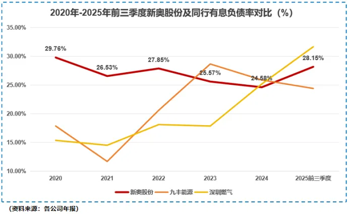 看资产负债表,2025年前三季度,新奥股份货币资金、交易性金融资产等易变现资产总额仅有191.45亿,难以覆盖长短期借款,总资产负债率已被推升至54.84%。