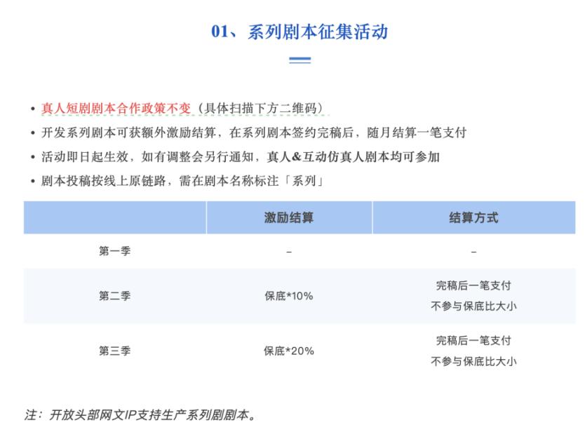 根据抖音集团短剧版权中心的公告,真人短剧的保底政策和分账期限都没有发生改变,并且其对系列剧、头部网文IP的长线开发依旧有政策激励。