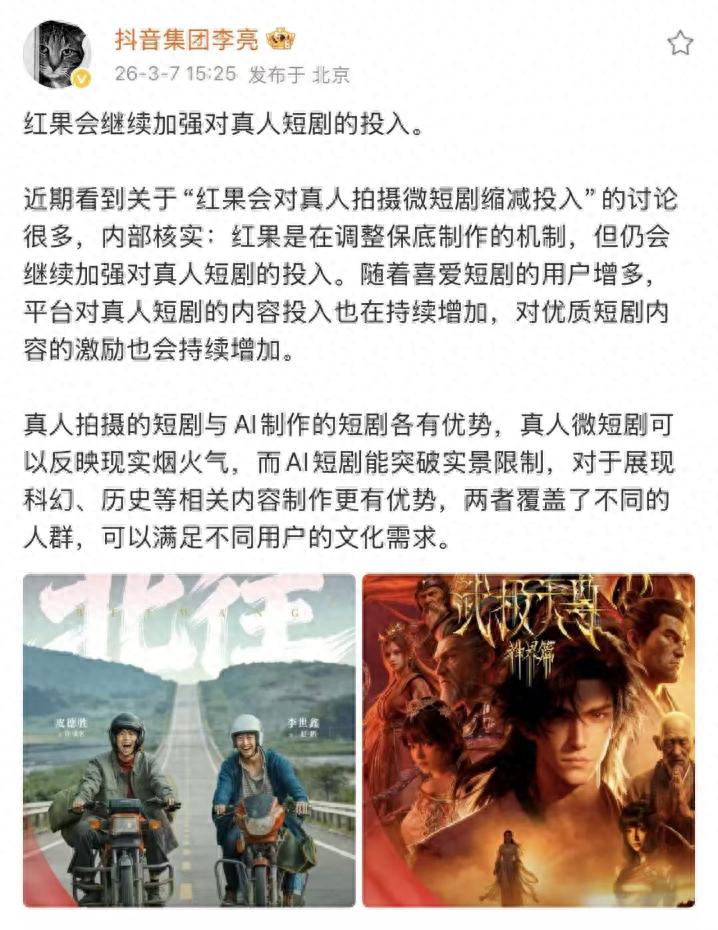 3月7日,抖音集团副总裁李亮在微博上进行回应,表示红果虽然调整了保底制作的机制,但仍会加强对真人短剧的投入。