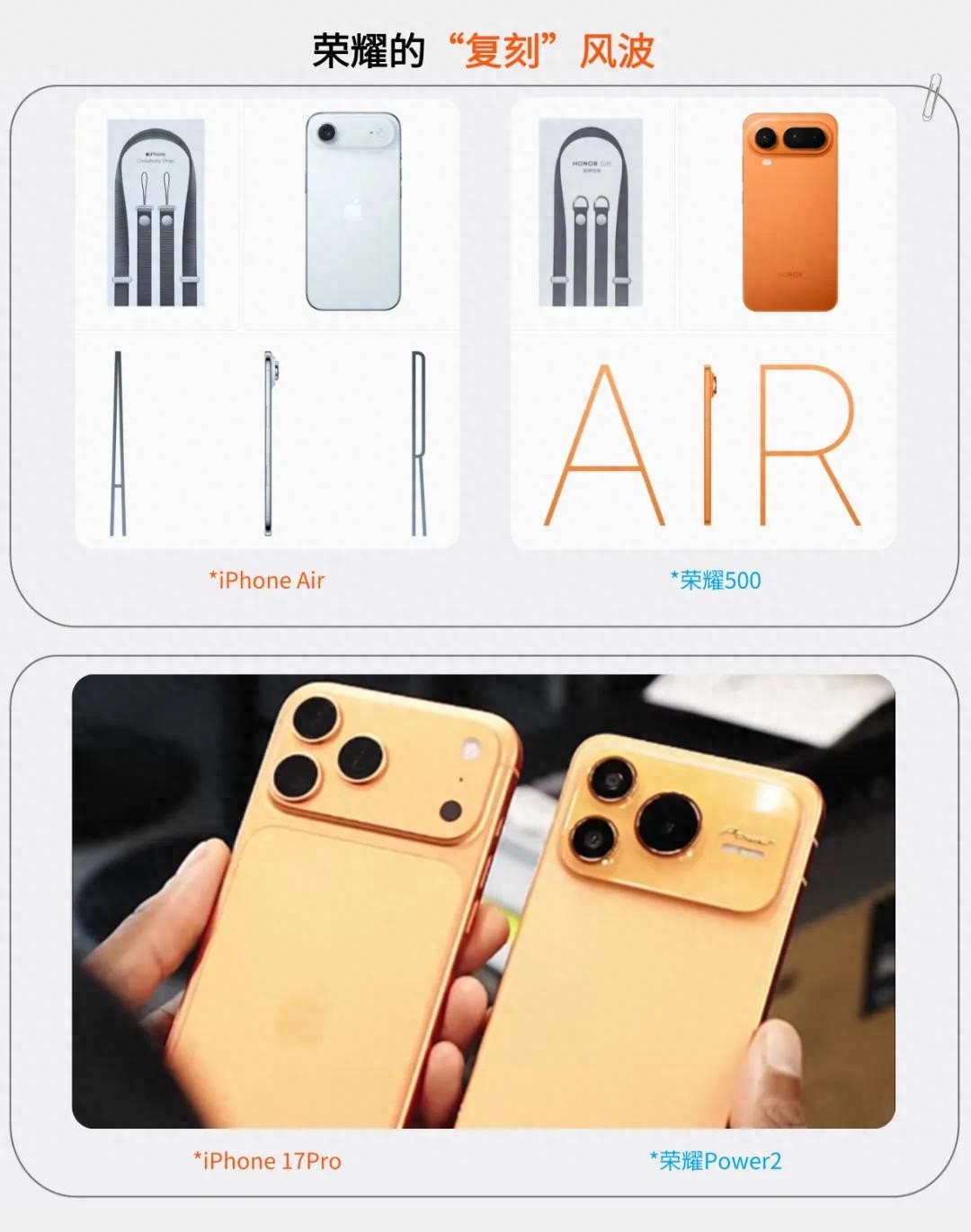 先看荣耀500系列。这大R角设计、横向式镜头模组,与iPhoneAir高度相似,不细看确实分不太清,你要说没借鉴很难服众啊。更有网友调侃“买荣耀500,花钱圆苹果梦”。