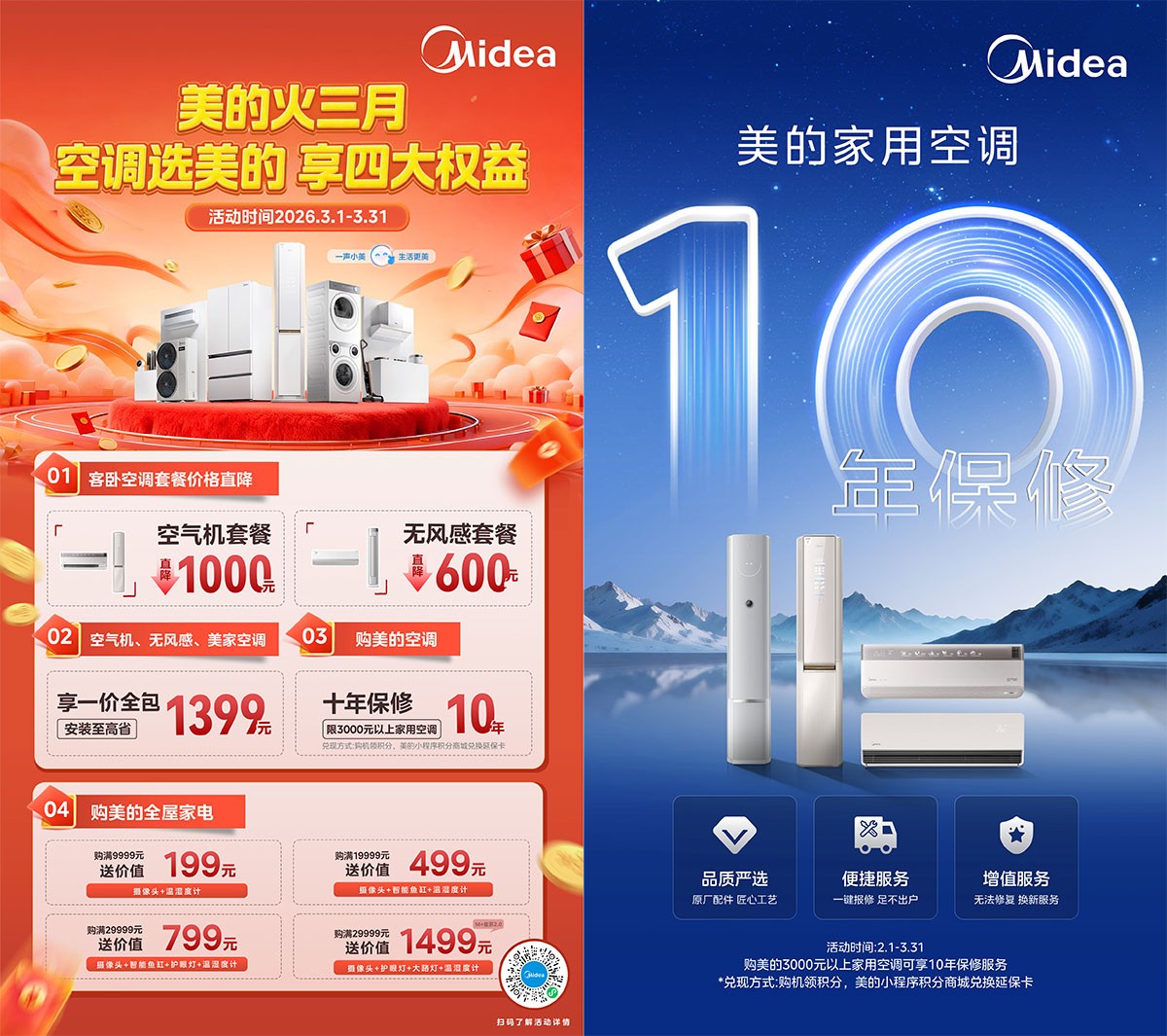 万维君从美的官方获悉,此次美的“火三月”活动将持续至3月31日,美的空气机套餐直降1000元、无风感套餐直降600元,购3000元以上家用空调享10年保修,所有福利均在美的智慧家线下门店同步开启,消费者到店即可享受这一核心福利,无需担心上门后被临时加价、强制消费,真正做到“明明白白消费、安安心心用机”。