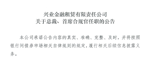 近日,兴业金融租赁有限责任公司发布关于总裁、首席合规官任职的公告,同意聘任司斌先生为公司总裁,并兼任公司首席合规官。
