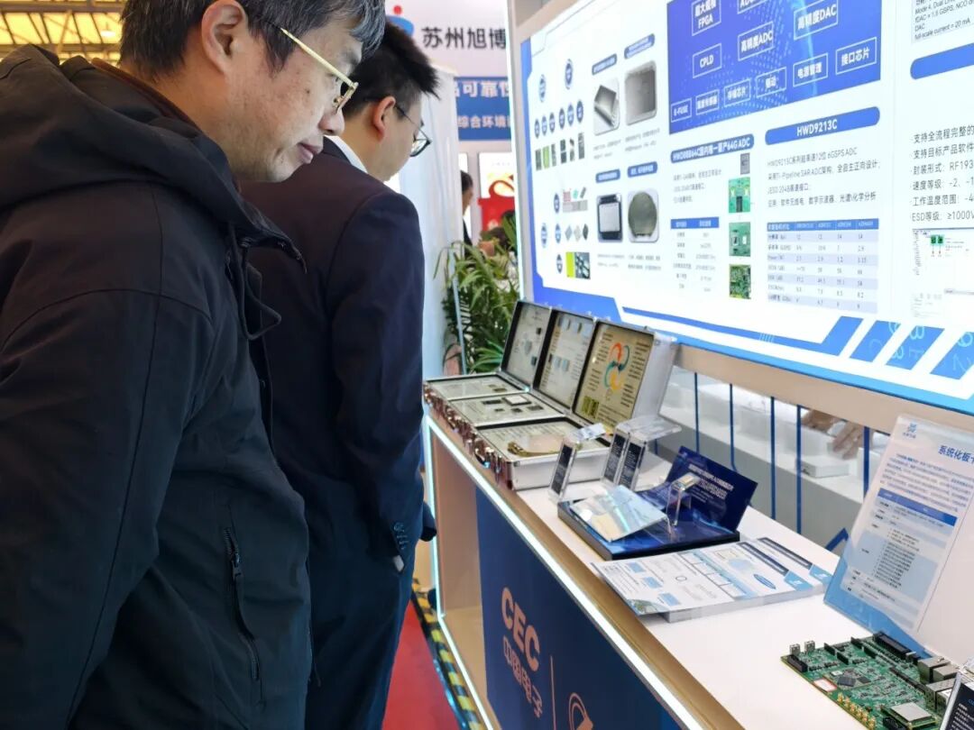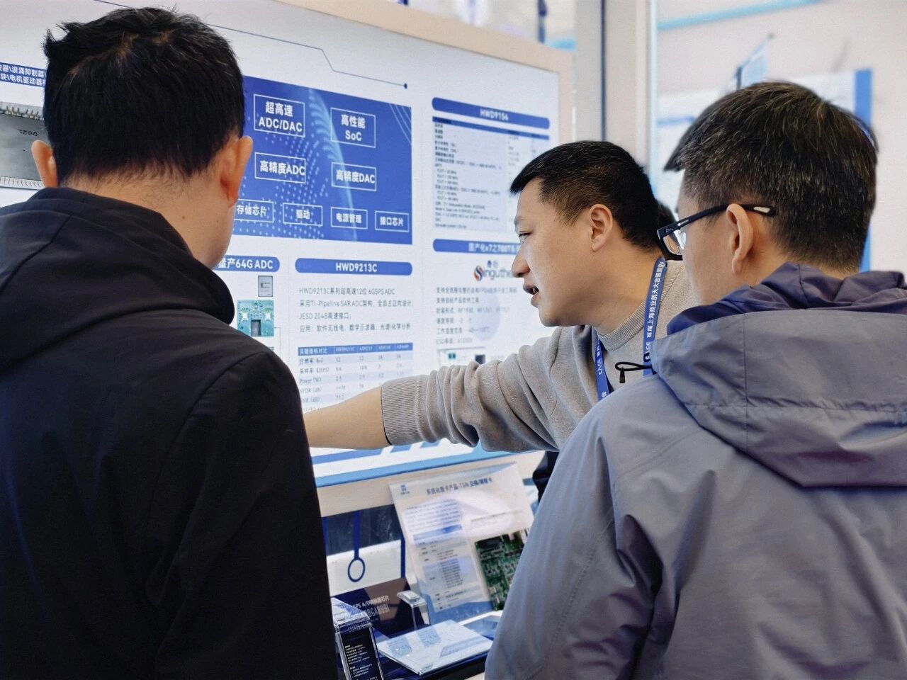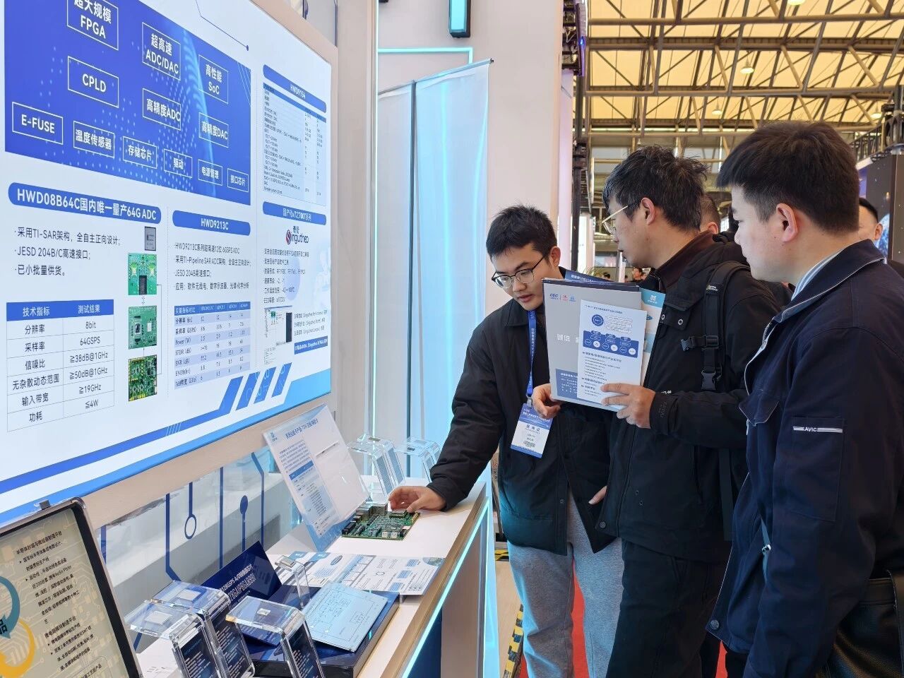 在中国振华展位上,成都华微产品展示区成为全场焦点之一。高速高精度数据转换器、TSN芯片等实物展品吸引了大批专业观众驻足观看。公司技术人员全程驻场,与来访客户深入交流技术细节与应用场景,现场气氛热烈,洽谈不断。