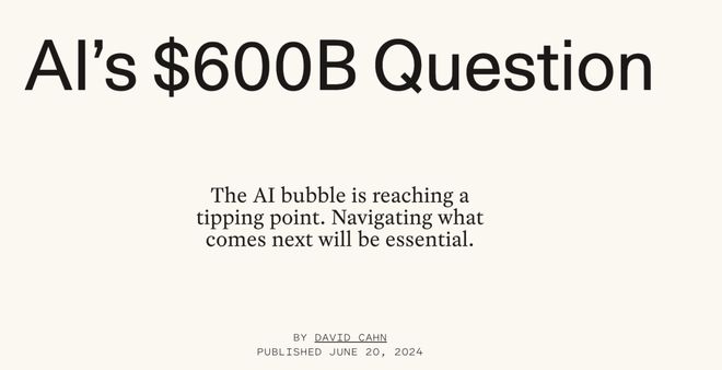 红杉资本合伙人David Cahn从2023年的《AI的2000亿美元问题》[1]劝到2024年的《AI的6000亿美元问题[2]》,随后贝恩公司接棒,去年预测到2030年,AI公司收入与满足计算需求的投入之间的缺口将达到8000亿美元[3]。