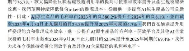 以MiniMax为例,其面向C端的AI原生产品在其收入占比中高达67.2%,然而截至2025年前三季度,该业务的整体毛利率仅为4.7%,勉强从2024年的严重亏损(-23.5%)转为微利。