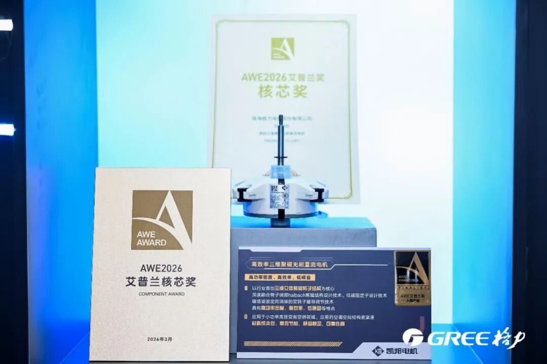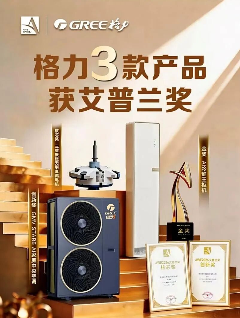 近日,备受瞩目的2026年中国家电及消费电子博览会(AWE2026)在上海盛大举行。被誉为“全球智慧生活领域奥斯卡”的艾普兰奖获奖名单正式揭晓。格力电器凭借对用户需求的深刻洞察与核心技术突破,Ai冷静王柜机荣获「金奖」,三维聚磁无刷直流电机荣获「核芯奖」,GMV Star5 AI家庭中央空调荣获「创新奖」。