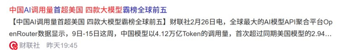 据OpenRouter数据显示,中国模型调用量在2月连续两周超过美国,其中国内四款大模型占据全球前五。