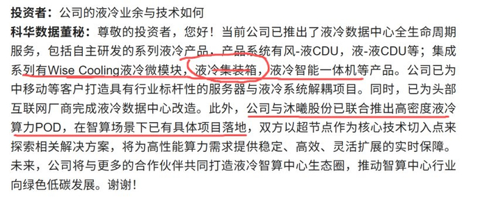 集装箱数据中心:公司在投资互动上表示,当前公司已推出了液冷数据中心全生命周期服务,包括自主研发的系列液冷产品,产品系统有风-液CDU,液-液CDU等;集成系列有Wise Cooling液冷微模块,液冷集装箱,液冷智能一体机等产品。
