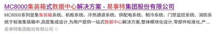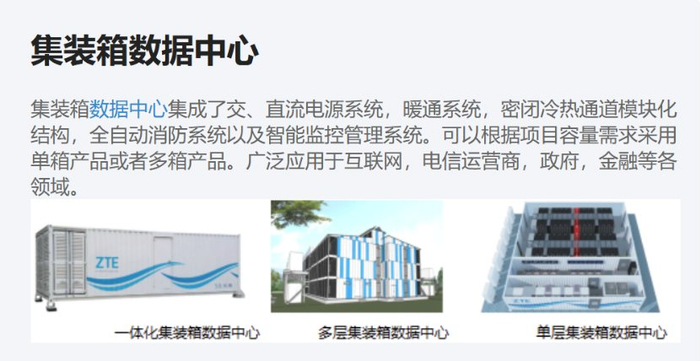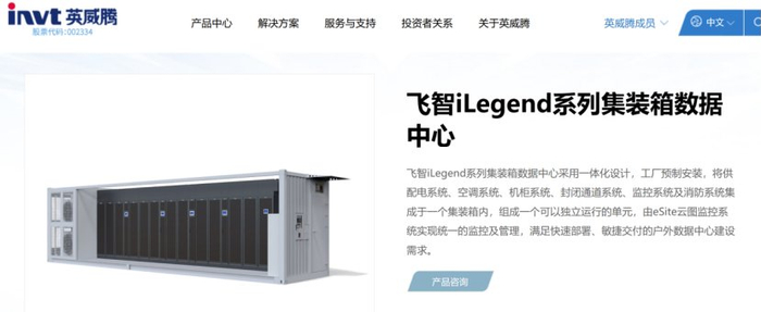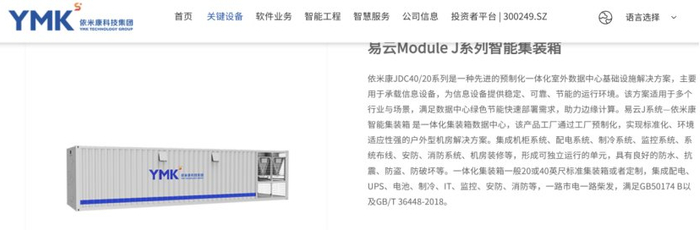 集装箱数据中心:公司官网展示了,集装箱数据中心解决方案——依米康JDC40/20系列。该方案是预制化、一体化的室外数据中心基础设施解决方案,为信息设备提供稳定、可靠、节能的运行环境,实现标准化、环境适应性强的户外型机房解。