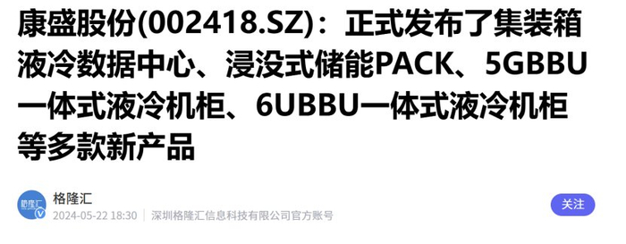 集装箱数据中心:公司在2024年5月正式发布了集装箱液冷数据中心、浸没式储能PACK、5GBBU一体式液冷机柜、6UBBU一体式液冷机柜等多款新产品。