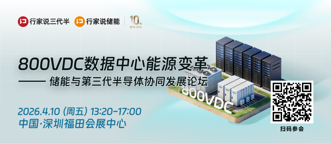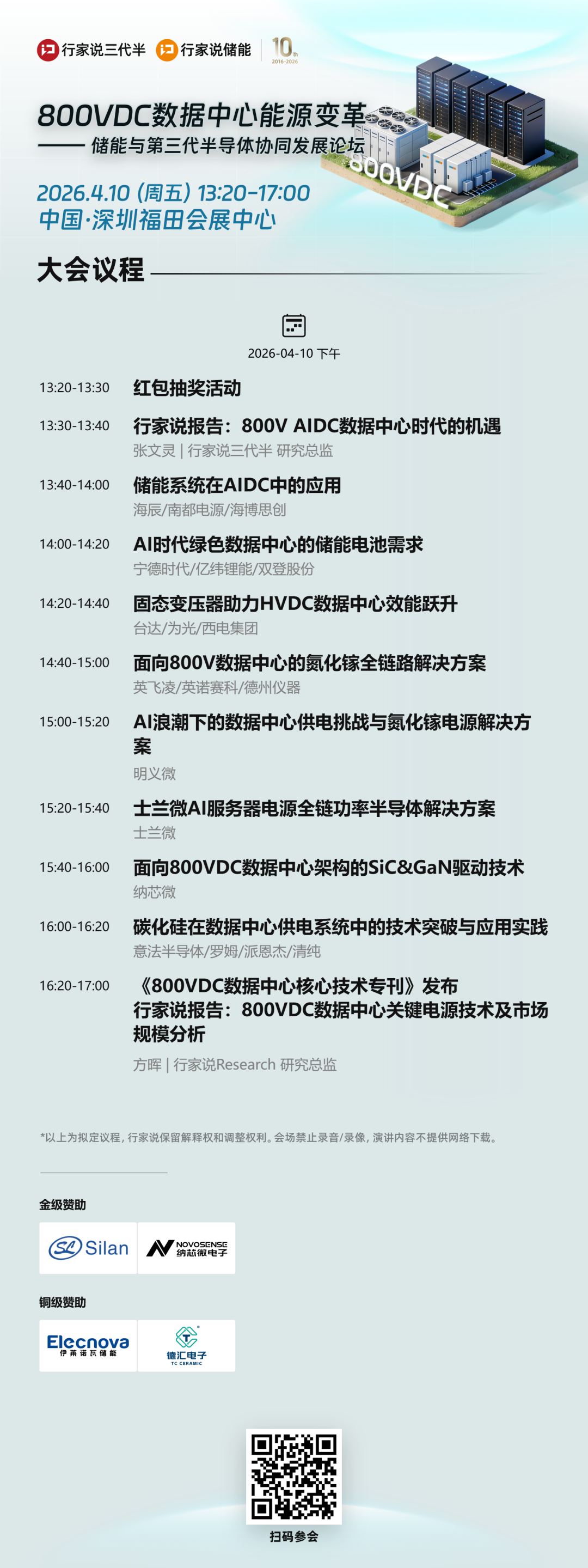 为深入探讨800V直流架构下,储能系统与第三代半导体的融合创新路径,行家说将于2026年4月10日在深圳举办“800VDC数据中心能源变革——储能与第三代半导体协同发展论坛”。