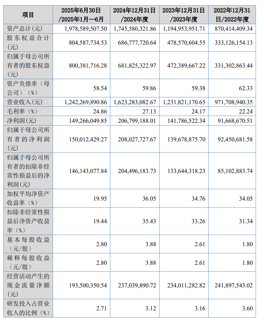 报告期内(2022年至2025年上半年),欧伦电气的营业收入分别为9.72亿元、12.32亿元、16.23亿元、12.42亿元;净利润分别为9166.87万元、1.42亿元、2.07亿元、1.49亿元。