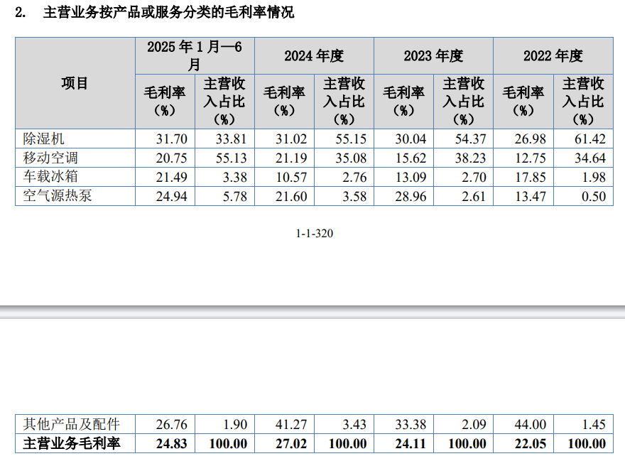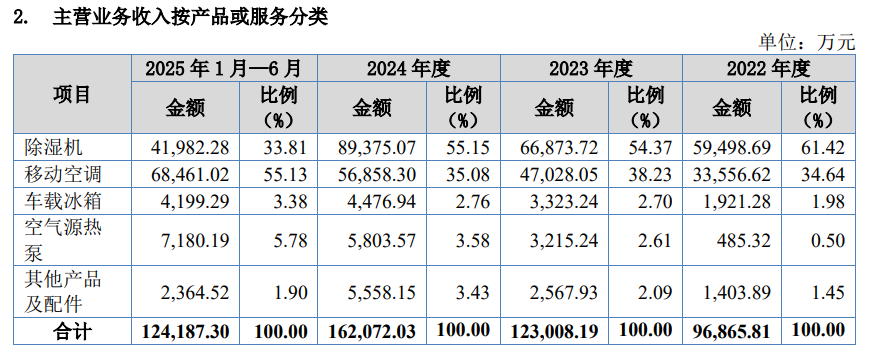 在第二轮问询函中,业绩增长合理性及持续性,根据申请文件及问询回复:(1)2023年至2025年1-6月,公司主营业务收入分别同比增长26.99%、31.76%、38.68%,主要是移动空调和除湿机销售量持续增长,同时公司推出车载冰箱和空气源热泵两大新兴产品并实现大幅增长。(2)2023年至2025年1-6月移动空调销售收入增幅分别为40.15%、20.90%、51.24%,移动空调行业出口量在2022年、2023年有所回落;公司除湿机销售收入增幅分别为12.40%、33.65%、4.27%,增长主要源于外销,欧洲市场增加较快,但2022年至2023年中国家用除湿机对欧洲市场出口量持续下降,2025年1-6月,境内除湿机销量为530.8万台,同比下滑11.4%,2025年4月至8月,中国境外家用除湿机月销量同比下滑。(3)报告期内,公司除湿机产品整体平均销售单价呈下降趋势,2022-2024年度,公司移动空调产品平均售价总体保持稳定,2025年1-6月出现下降。(4)报告期公司前十大客户销售额存在较大波动,公司在部分主要OEM/ODM客户的供应份额下降或客户采购需求下降。(5)公司与ODM/OEM客户的合作均需经历一个从试样、小批量采购到大批量合作的导入过程,新品导入周期约10–12个月,老品导入周期约4-5个月。