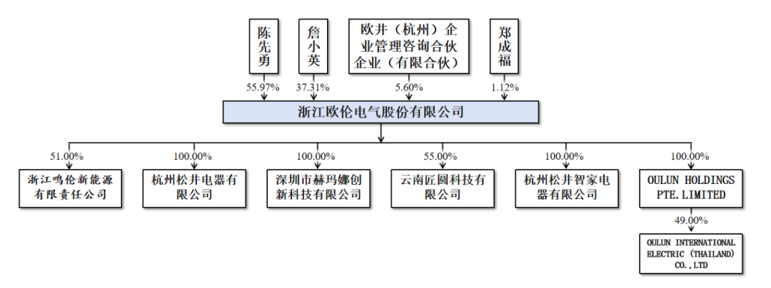 陈先勇、詹小英系夫妻关系,截至本招股书签署之日,陈先勇直接持有公司55.97%股份,通过欧井杭州间接持有公司2.75%的股份,且陈先勇为欧井杭州普通合伙人并担任执行事务合伙人,合计控制公司61.57%的股份;詹小英直接持有公司37.31%股份,陈先勇、詹小英直接和间接合计控制公司98.88%的股份,为公司的实际控制人。