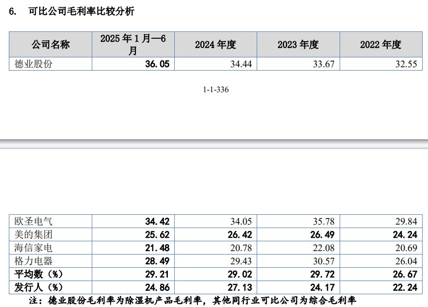 报告期内,公司综合毛利率为22.24%、24.17%、27.13%及24.86%,毛利率与美的集团、海信家电较为接近,较德业股份、格力电器、欧圣电气相比偏低。