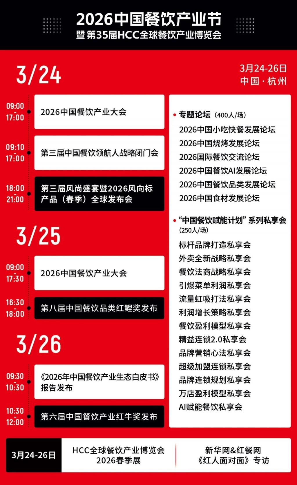 在此背景下,2026中国餐饮产业节暨第35届HCC全球餐饮产业博览会应运而生。本届产业节由世界中餐业联合会、红餐网联合主办,以"竞合·共赢"为主题,将于3月24-26日在杭州大会展中心举办。