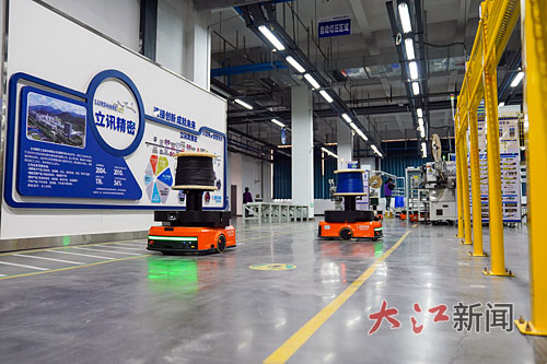 协讯电子生产车间,自动导向车载着物料灵活穿梭。本报全媒体记者邹宇波摄