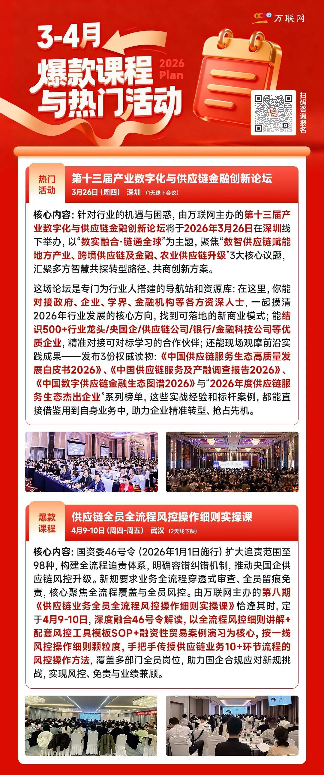 其一,万联网与中国人民大学中国供应链战略管理研究中心联合编制的《中国供应链服务及产融调查报告2026》,将依托上市公司年报数据及多领域企业调研反馈,全面洞察供应链及供应链金融领域的现状、趋势及挑战,同步呼应APQC报告的全球趋势研判,为企业战略制定提供数据支撑。